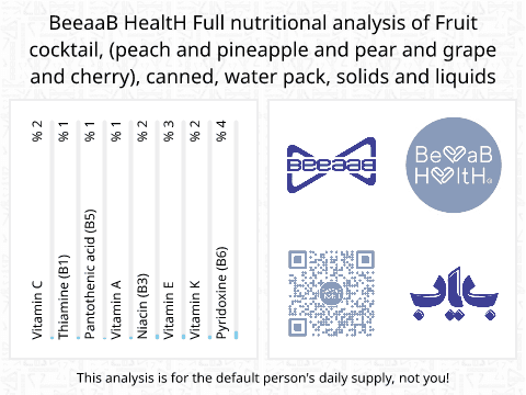 BeeaaB HealtH nutritional analysis of Fruit cocktail, (peach and pineapple and pear and grape and cherry), canned, water pack, solids and liquids